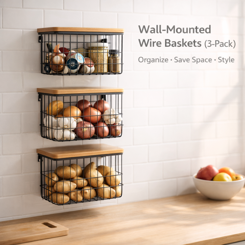 Free up counter space and keep everyday items within reach with this 3-pack wall-mounted storage basket set. Each basket folds up when not in use and can be used two ways—mounted on the wall or placed on the countertop. Made with carbon steel wire baskets and wood lids, it’s a practical organizer for fruit, onions, potatoes, snacks, coffee pods, spice jars, and pantry staples.